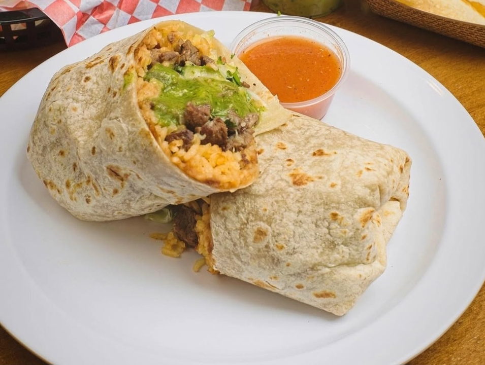Big Flour tortilla filled with rice, refried beans, lettuce, Monterrey cheese, onions, crema, cilantro and Asada (Beef)